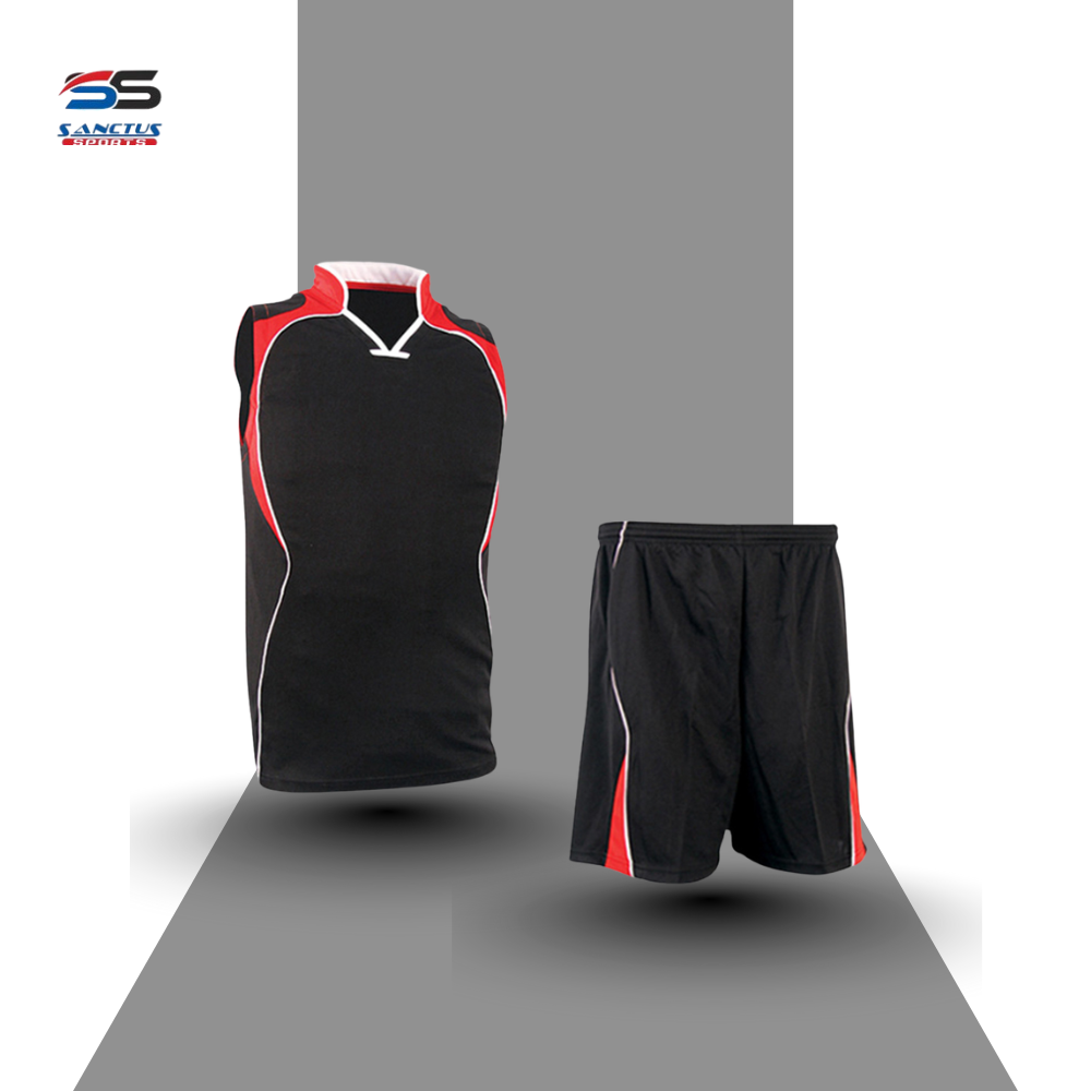 Black, Red, and White V-Neck Basketball Uniform Set with Curve Design