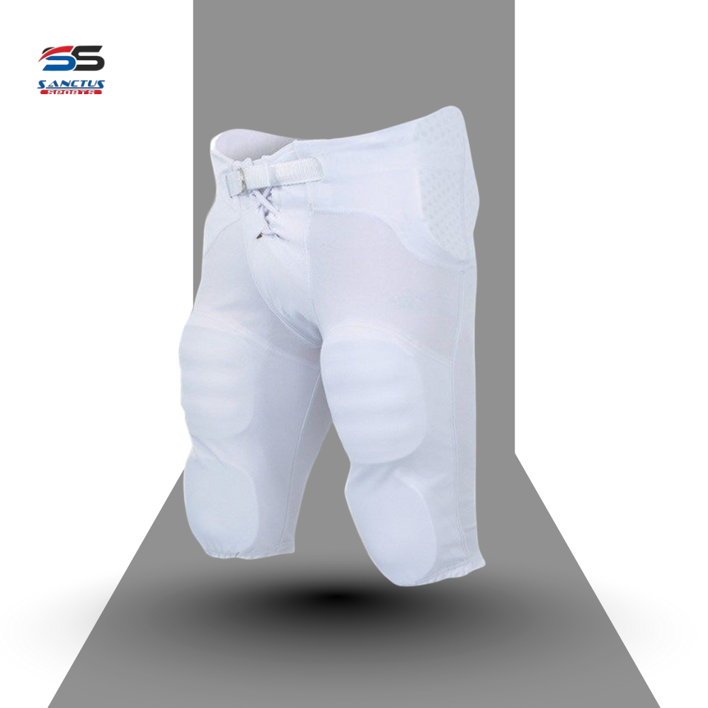This is a pair of white athletic pants designed for contact sports, specifically American football. The pants feature integrated padding for protection during play.